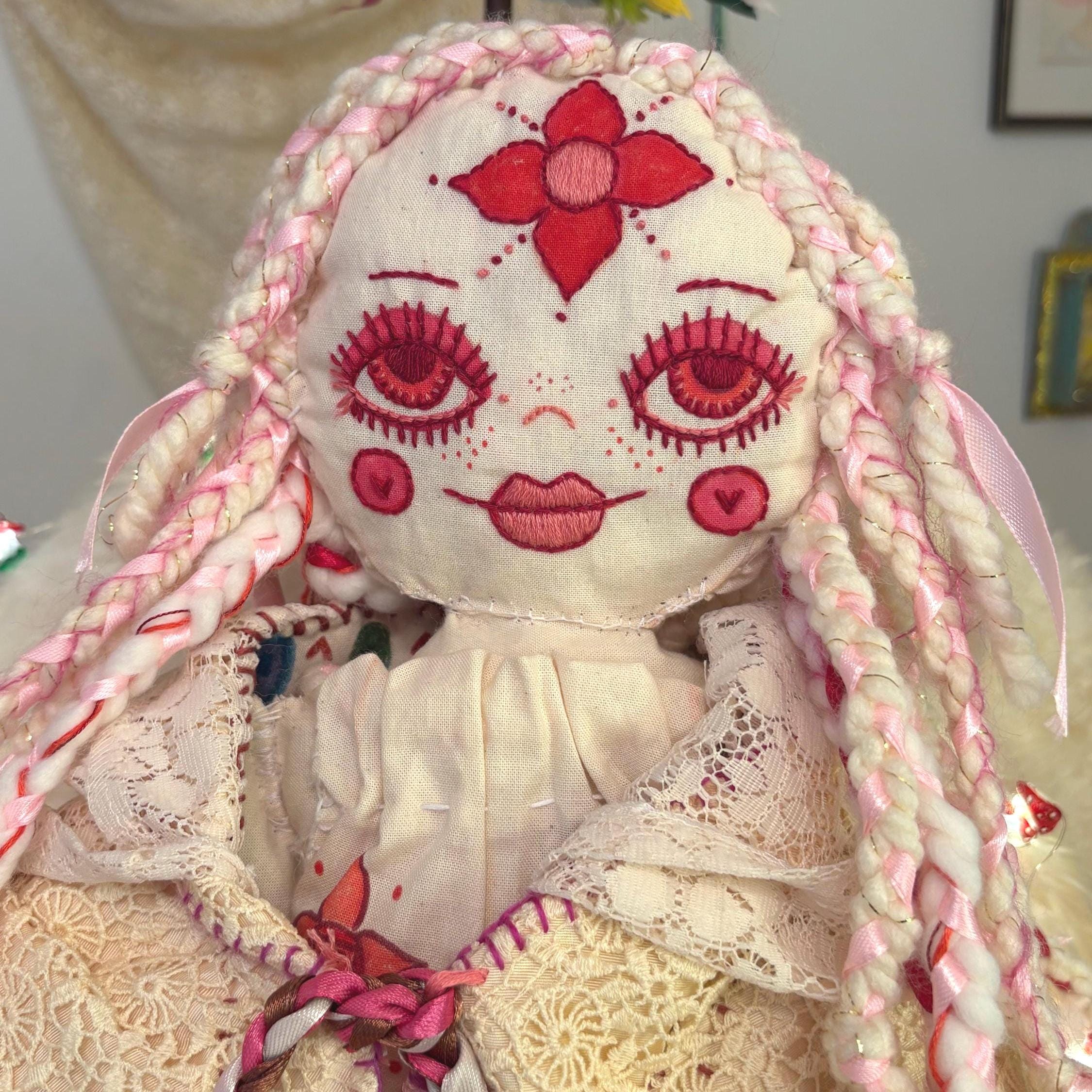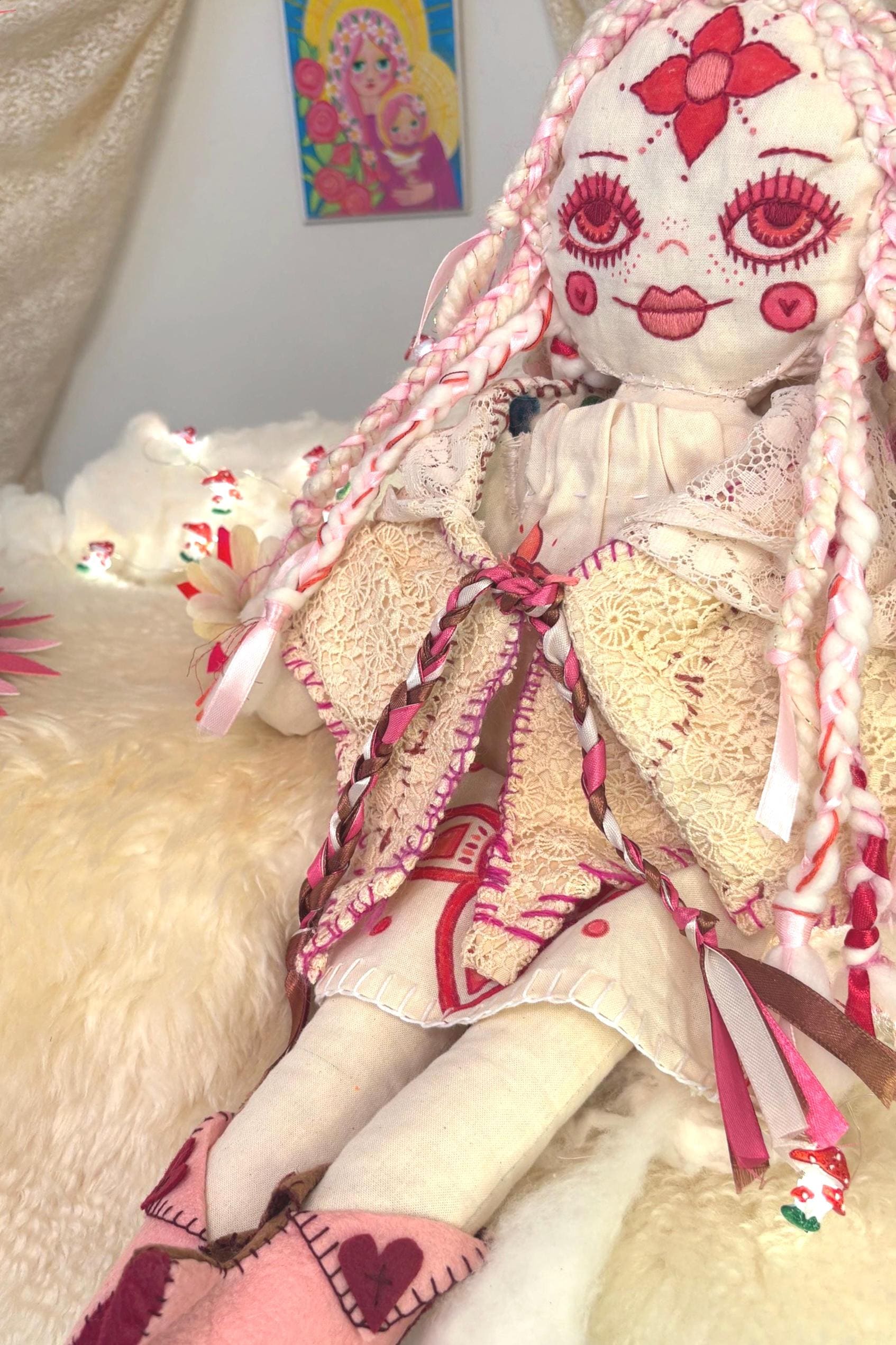 Soft Handmade Root Chakra Rag Doll. Made with natural fibers, scarps of old fabric, natural wool yarn and stuffing. Connect with your roots, "I am abundant within myself."